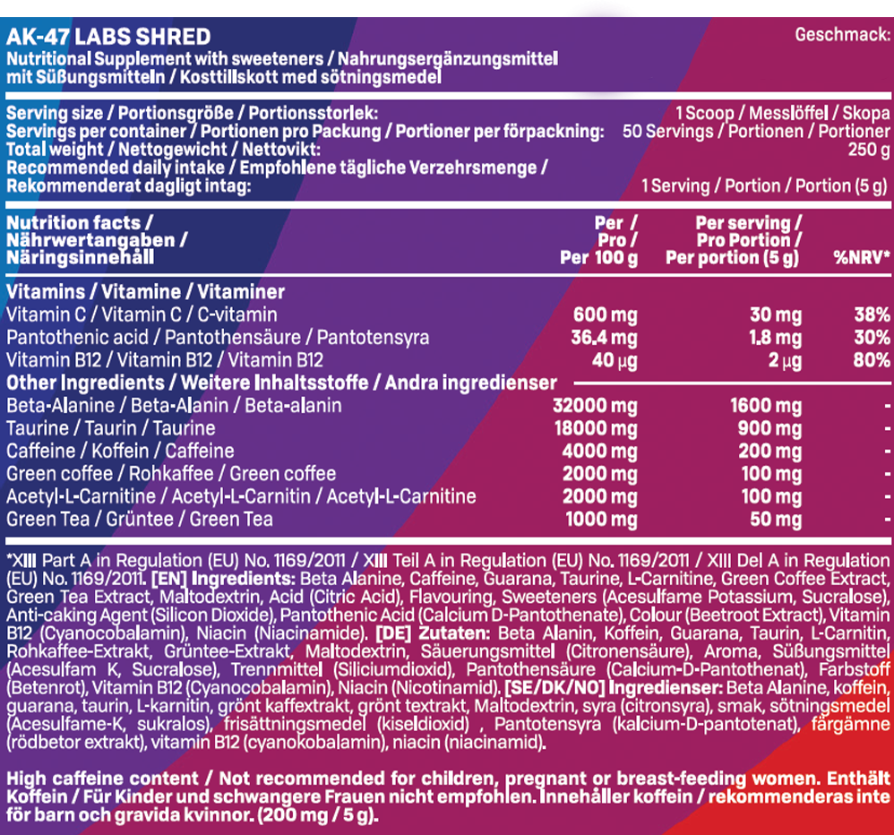 AK-47 Labs SHRED är tillverkad med noggrant utvalda kvalitetsingredienser för att ge dig resultat. Utöver prestationshöjare får du även ingredienser som hjälper till att stödja din viktminskning. Perfekt för dig som vill nå nästa nivå i gymmet – eller vid stranden.