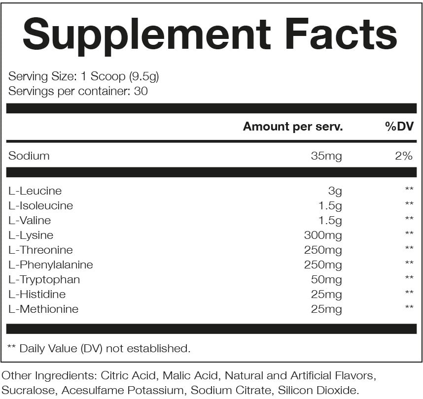 Blanda en skopa (9,5 g) med vatten. Drick under eller efter träning, eller när som helst under dagen för att komplettera ditt dagliga intag av aminosyror.