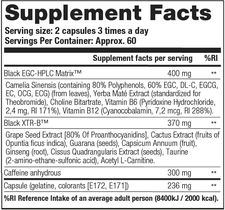 Stacker2 Black Burn är ett kraftfullt kosttillskott utformat för dig som är fullt fokuserad på att nå dina träningsmål. Varje portion innehåller 300 mg koffein samt en effektiv blandning av grönt te, yerba mate, guarana, ginseng och taurin. Formulan är dessutom berikad med vitamin B6, som bidrar till normal omsättning av protein och kolhydrater, samt vitamin B12, som stödjer normal energimetabolism. Oavsett om du följer ett strikt träningsschema eller bara behöver extra stöd i din vardag är Black Burn ett enkelt tillskott att införa i din rutin.