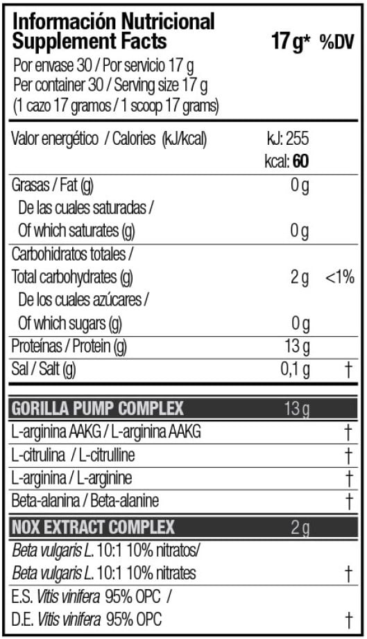 Varje portion innehåller det kraftfulla Gorilla Pump Complex med L-Citrullin och Beta-Alanin, samt det växtbaserade NOX Extract Complex, berikat med rödbets- och druvnitrater. En kompromisslös pump – helt stimfri.