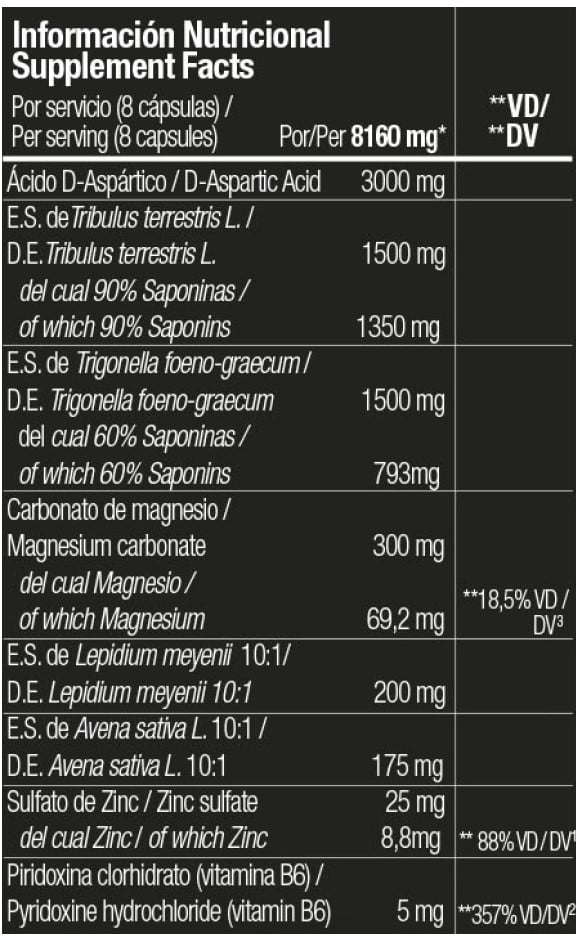 Formulan är förstärkt med 1500 mg Tribulus Terrestris (90 % saponiner), 1500 mg Fenu greek (50 % saponiner) och hela 3000 mg D-asparaginsyra. Med Wild Beast II är styrka inte ett val – det är ett faktum. Detta är inte ett tillskott för nybörjare. Välkommen till djungeln.